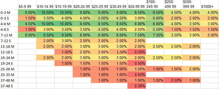 - It mitigates the artificial distinction between months. That 12-month versus 13-month difference that in a normal RFM analysis could be the difference between sending and not sending a communication? In this model, it’s about an 8% difference in scoring. Important, but not fatal.